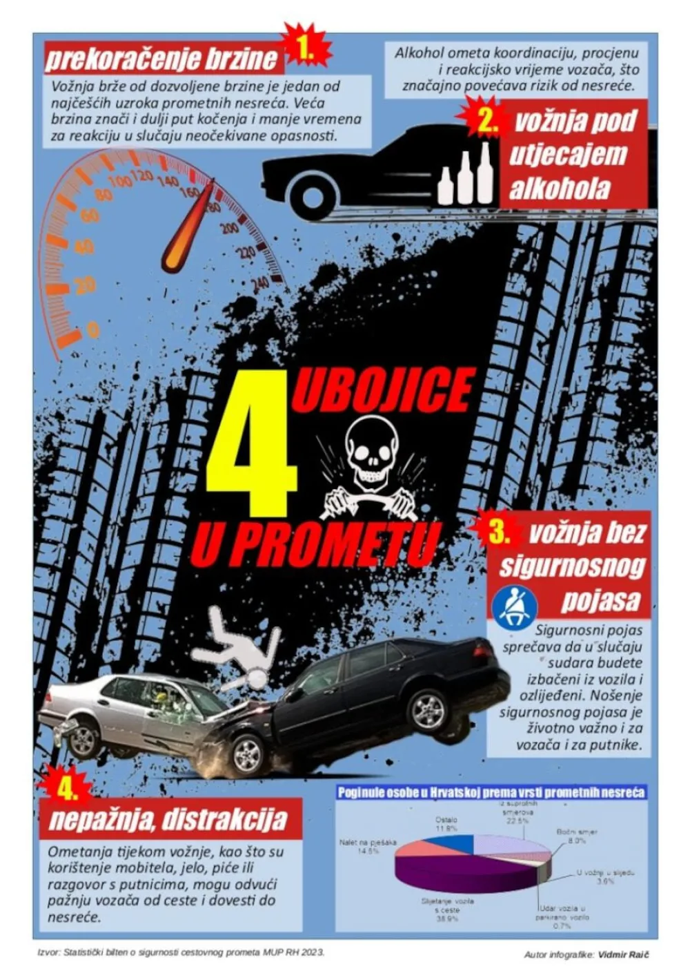 Izraz "četiri ubojice u prometu" odnosi se na četiri glavna uzroka teških prometnih nesreća i smrtnih slučajeva na cestama. Ma prvom mjestu to je vožnja pod utjecajem alkohola. Alkohol usporava reakcije, smanjuje koordinaciju i oštećuje vid, što uvelike povećava rizik od sudara. Slijedi neprilagođena brzina, jer prevelika brzina smanjuje vrijeme reakcije vozača i produžuje zaustavni put vozila, čime se povećava opasnost od nesreće, posebno u zavojima, na skliskim cestama ili u naseljenim mjestima. Na trećem jestu je nekorištenje sigurnosnog pojasa. Sigurnosni pojas je jedan od najvažnijih sigurnosnih elemenata u vozilu. On smanjuje rizik od smrtnih ozljeda u slučaju sudara za više od 50 posto. Naposljetku, tu je i distrakcija (ometanje koncentracije vozača), najčešće u pojavnom obliku u prometnim situacijama korištenje mobitela tijekom vožnje. Korištenje mobitela za vrijeme vožnje, bilo za razgovor ili slanje poruka, odvlači pažnju vozača s ceste i povećava rizik od sudara.