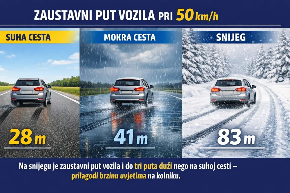 Jedna od najčešćih pogrešaka vozača zimi jest zadržavanje istog sigurnosnog razmaka kao u ljetnim uvjetima. Na snijegu i poledici razmak između vozila mora biti višestruko veći kako bi se ostavilo dovoljno vremena za reakciju i sigurno zaustavljanje. Posebno je važno promatrati promet daleko ispred sebe, predviđati ponašanje drugih sudionika i pravodobno reagirati na promjene u prometnom toku.